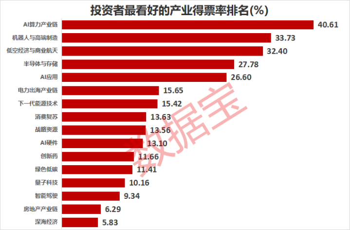 第一梯队(得票率30%~40%):AI算力产业链(40.61%)、机器东谈主与高端制造(33.73%)、低空经济与买卖航天(32.40%),三大领域强势领跑,彰显市集对高端制造与新质坐褥力的厉害信心。