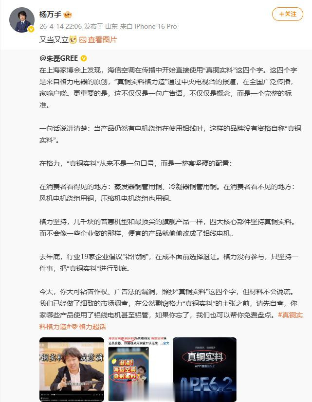 近日,格力电器(000651.SZ)商场总监朱磊在酬酢平台发文,直指海信空调在上海家博会上平直使用格力原创的“真铜实料”四字进行宣传,更指出:住持具仍有电机绕组使用铝线时,这么的品牌莫得经验自称“真铜实料”。