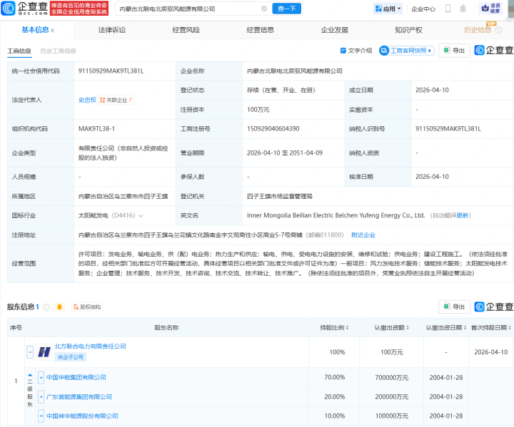 企查查APP浮现,近日,内蒙古北联电北辰驭风动力有限公司种植,法定代表东谈主为史忠权,米兰app官网版磋磨界限包含:发电业务、输电业务、供(配)电业务;热力坐蓐和供应;风力发电期间就业;储能期间就业等。企查查股权穿透浮现,该公司由朔方纠合电力有限累赘公司全资捏股,后者由中国华能集团有限公司、中国神华(601088.SH)等共同捏股。