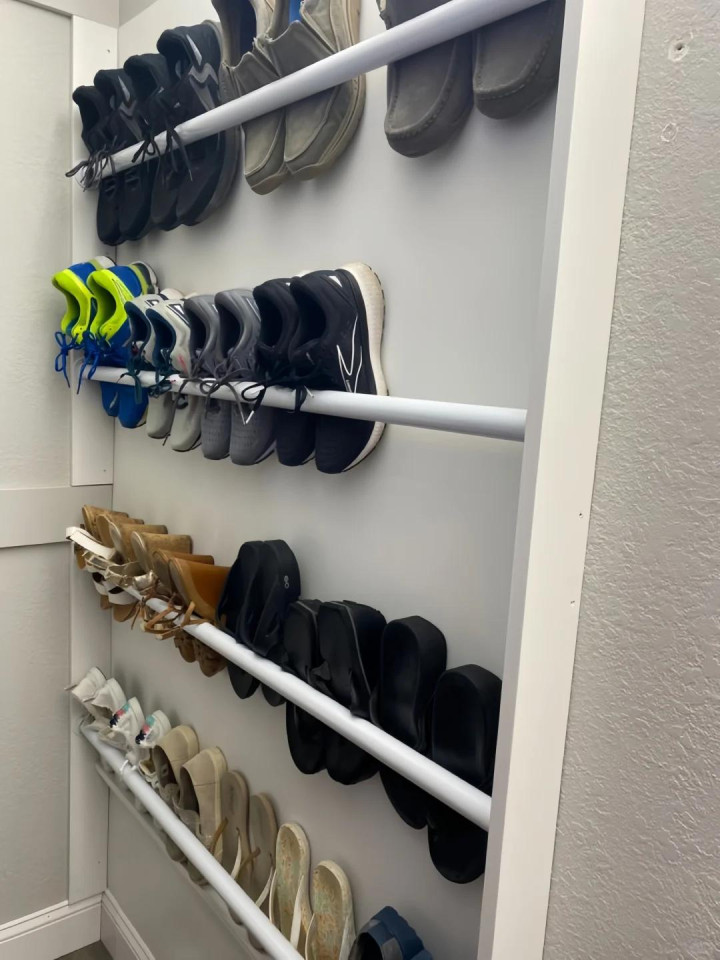 有些东谈主屋子住深切,东谈主多了,鞋柜就不够用了,有些东谈主买的是二手房,手头相比拮据了,也不盘算推算再装修了,这时间想要引申鞋子的收纳,那就可以诈欺挂衣杆,诈欺墙体和柜子作念复古,大概就用挂衣杆在墙上作念复古,然后就有了一个收纳量很可以的临时鞋柜。
