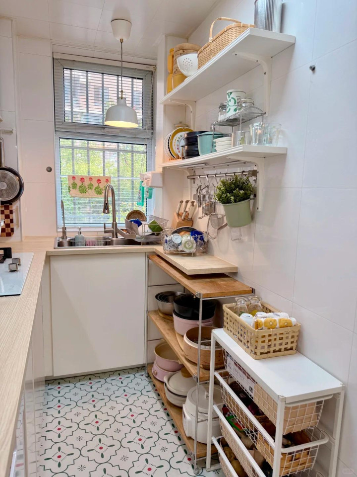 这个宽度对小厨房来说,照实是有点花消了,这时间可以议论移动支架来赞理储物,移动支架上头可以收纳临时的瓜果蔬菜,可以放厨房小电器,可以存储米面。