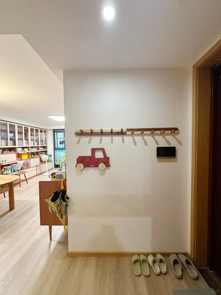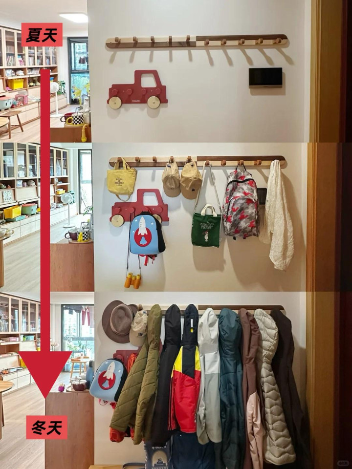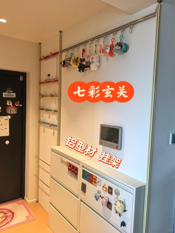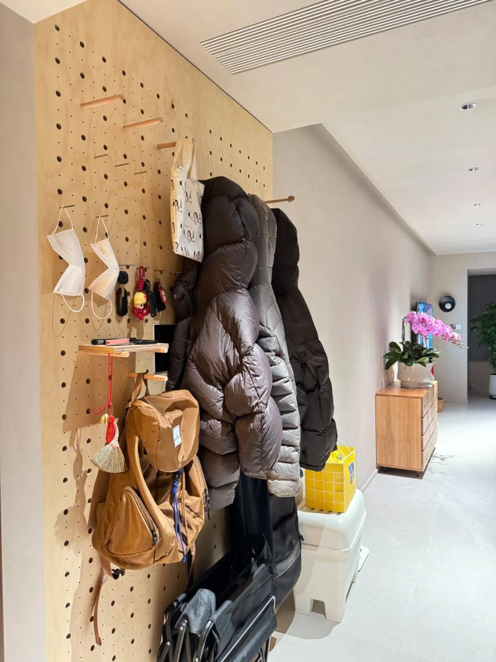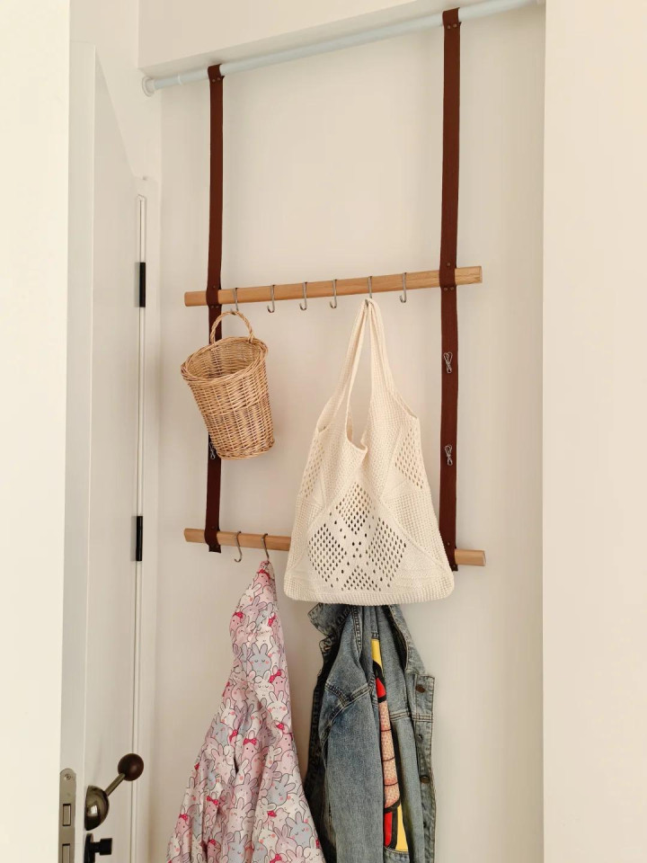这些东西扔客厅太凌乱,入户又莫得场合作念收纳柜,那就可以议论把它们通通齐挂在入户玄关这里。