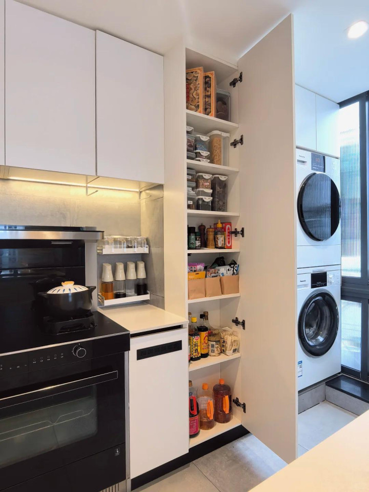 这么就开释了无数的橱柜台面空间和柜体空间,让厨房本就不大的橱柜更实用,更好用。