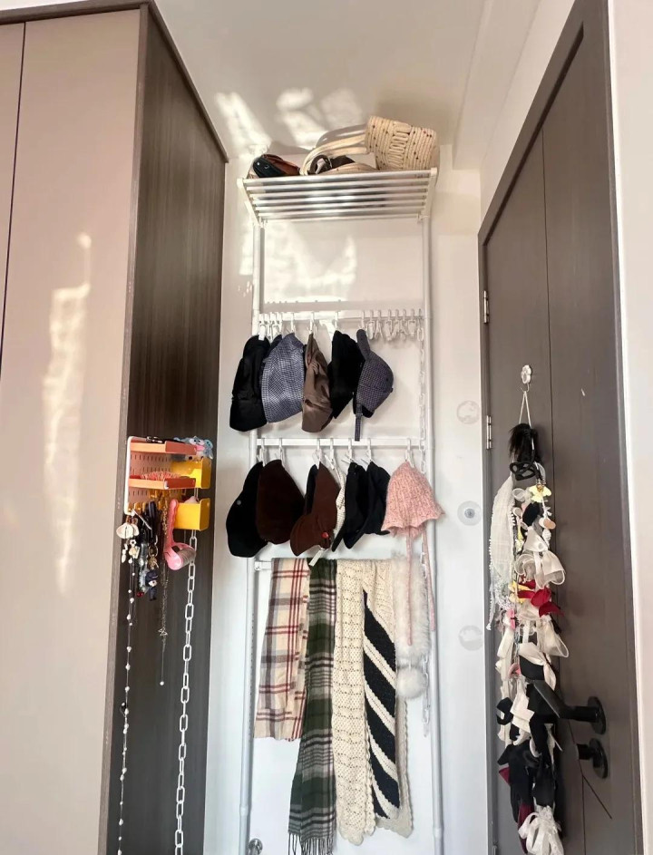 比如可以在行径支架上头作念隔板放东西,挂东西,也可以在墙面用挂衣杆和挂钩挂东西。
