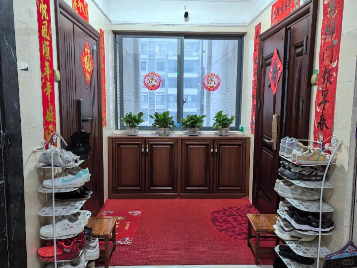 假如你所在的小区对此责罚相比松,假如你家门口外面有一定的空间,且放一个90厘米宽一米高的平时鞋柜不影响,不占用邻居门口的话,那就在门外放一个这么的鞋柜,这么一家几口常穿的鞋就可以在这里收纳,这么就大大缩小了室内玄关收纳的压力。