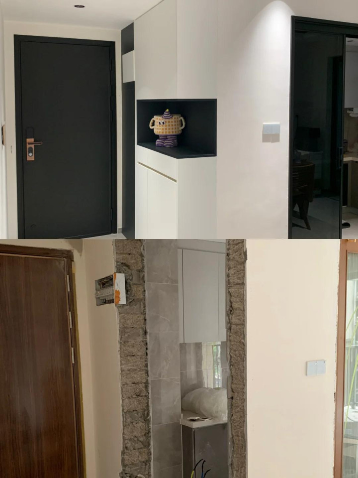 假如小户型开门一边是厨房墙体,且这个墙体不是承重墙,那就平直把墙体敲掉,大概掏空一半,借用墙体厚度作念鞋柜,这么鞋柜里面照旧圭臬尺寸,但外部只占用了很少的玄关走谈空间,不影响走谈的通过,也不压抑,固然会多花少量钱,但这钱花的值。