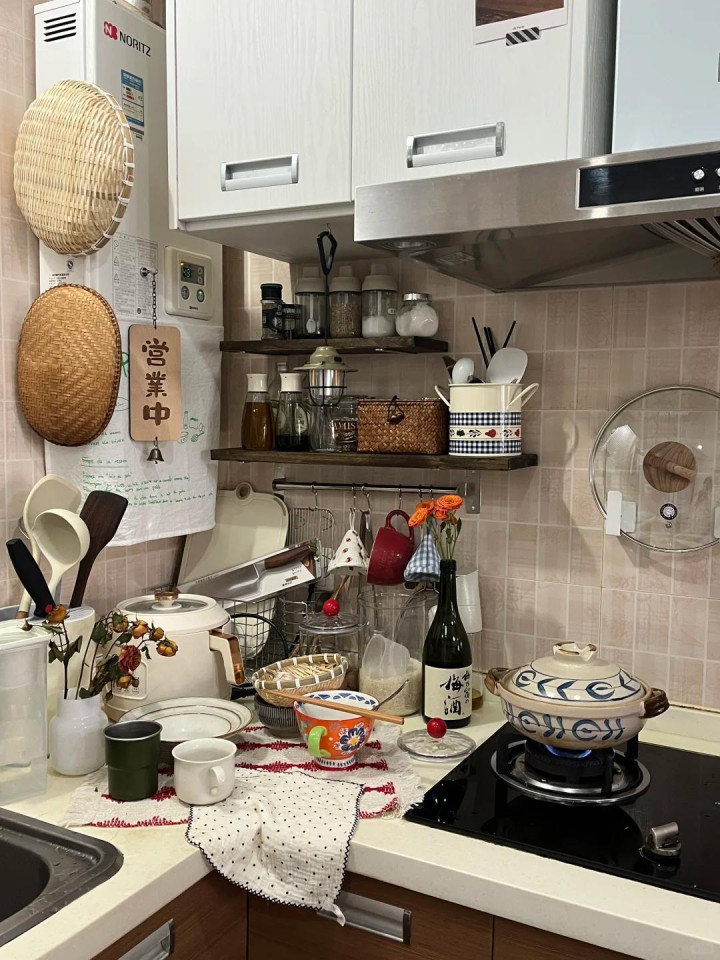 其实诈欺橱柜和烟谈的深度差作念柜子,柜子无须作念背板,就能作念出很实用的小物品收纳柜,固然这里唯一10-12厘米,不外厨房里本就小物品多,这个深度够用了。