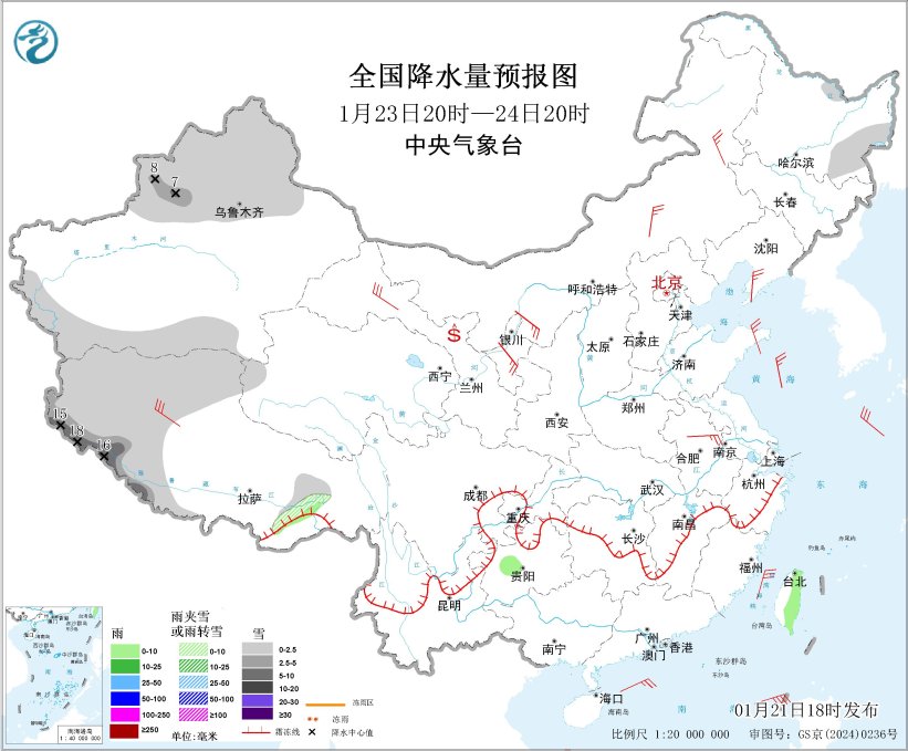 图4 全国降水量预报图(1月23日20时-24日20时)