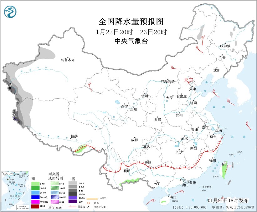1月22日夜间至24日,新疆西部、西藏西南部的部分地区有中到大雪,局地有暴雪或大暴雪。期间,青藏高原自西向东将出现小到中雪,降雪过后气温下降6~8℃,局地可超过10℃。