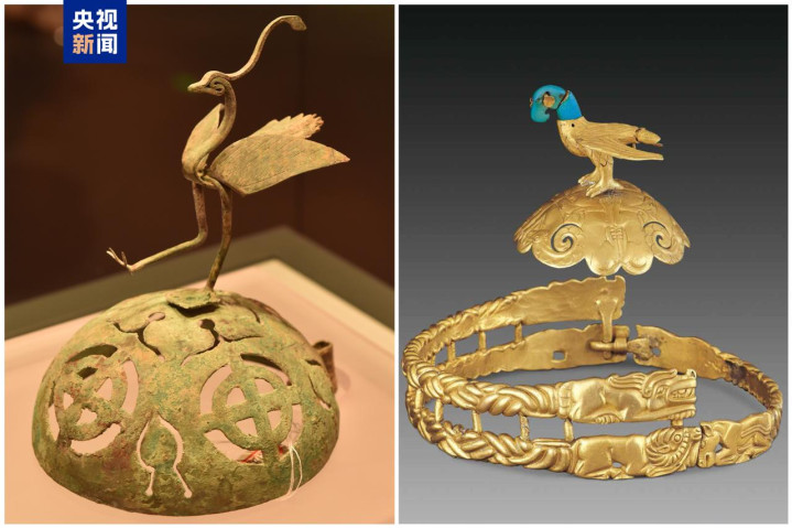 △右图:战国鹰顶金冠饰内蒙古博物院藏,是我国迄今截止发现的独逐个件匈奴王金冠。