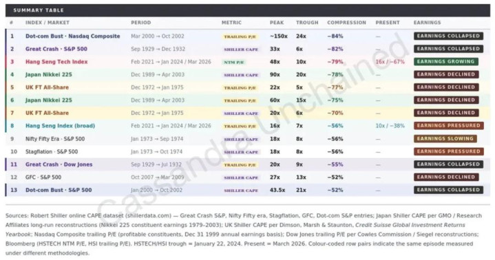 他通过复杂的席勒周期调度市盈率(CAPE)对比发现,恒生科技指数这五年的跌幅,在东说念主类历史上系数紧要熊市中排行第二或第三,严重过程以至跨越了2000年的互联网泡沫离散。