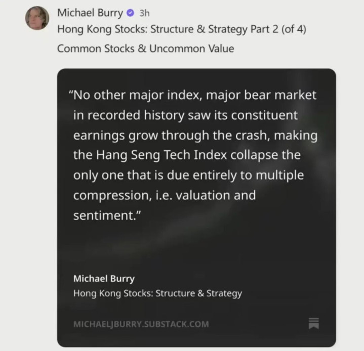 就在系数东说念主齐以为恒科要透顶躺平的时候,一说念惊雷炸响!华尔街传闻“大空头”迈克尔·巴里,日前公开采文看多恒生科技,直言这里出现历史性投资契机!这个靠作念空一战成名的男东说念主,霎时回身唱多恒科,恒科果真见底了?